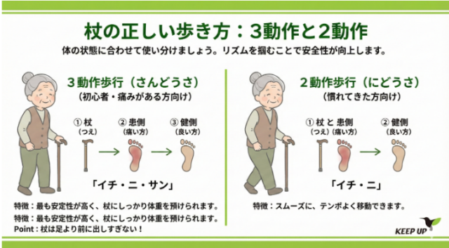 杖歩行では、身体の状態や習熟度に合わせて「3動作歩行」と「2動作歩行」を使い分けるのが基本です。このリズムをつかむことで、安全性が大きく向上します。